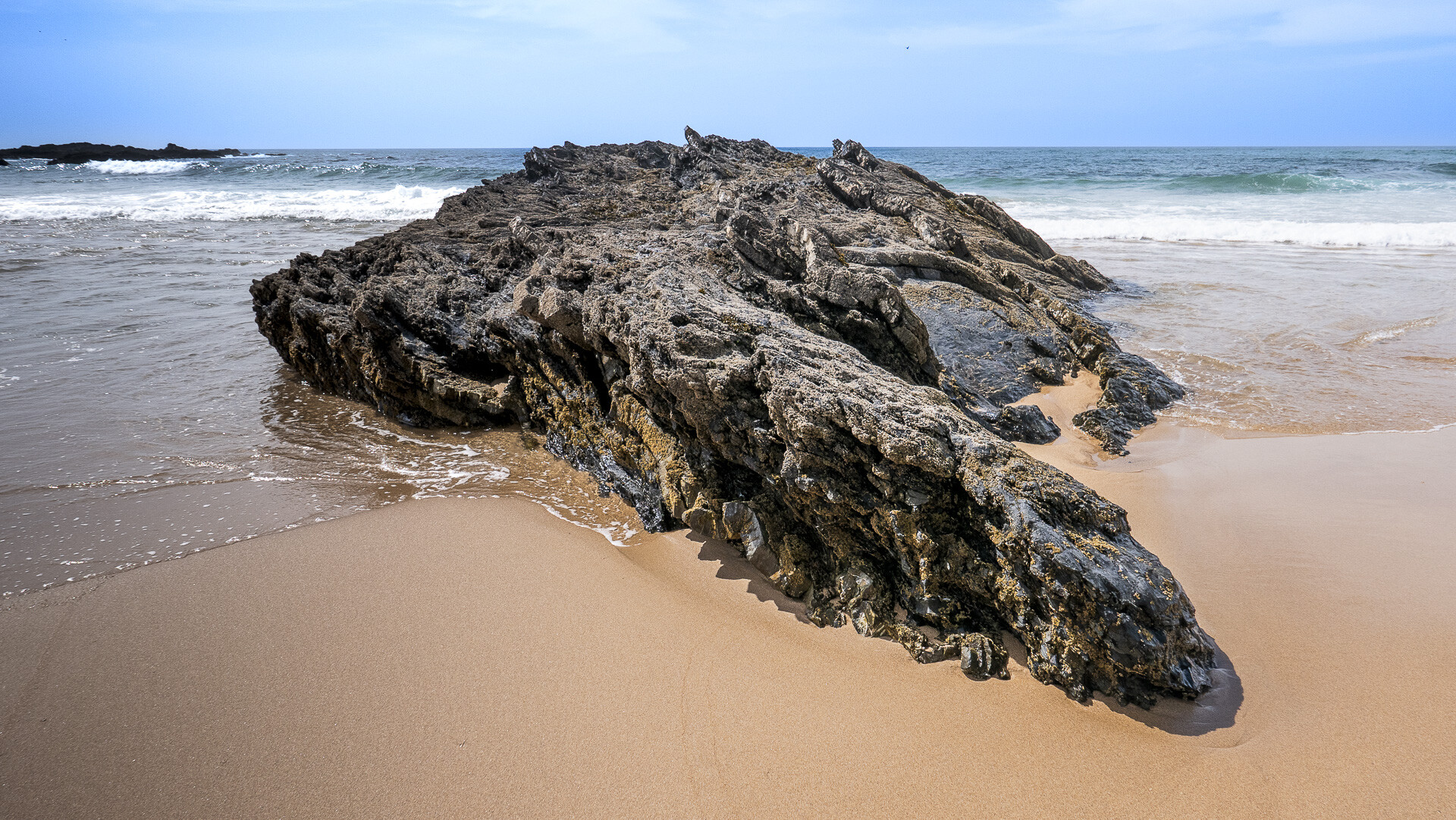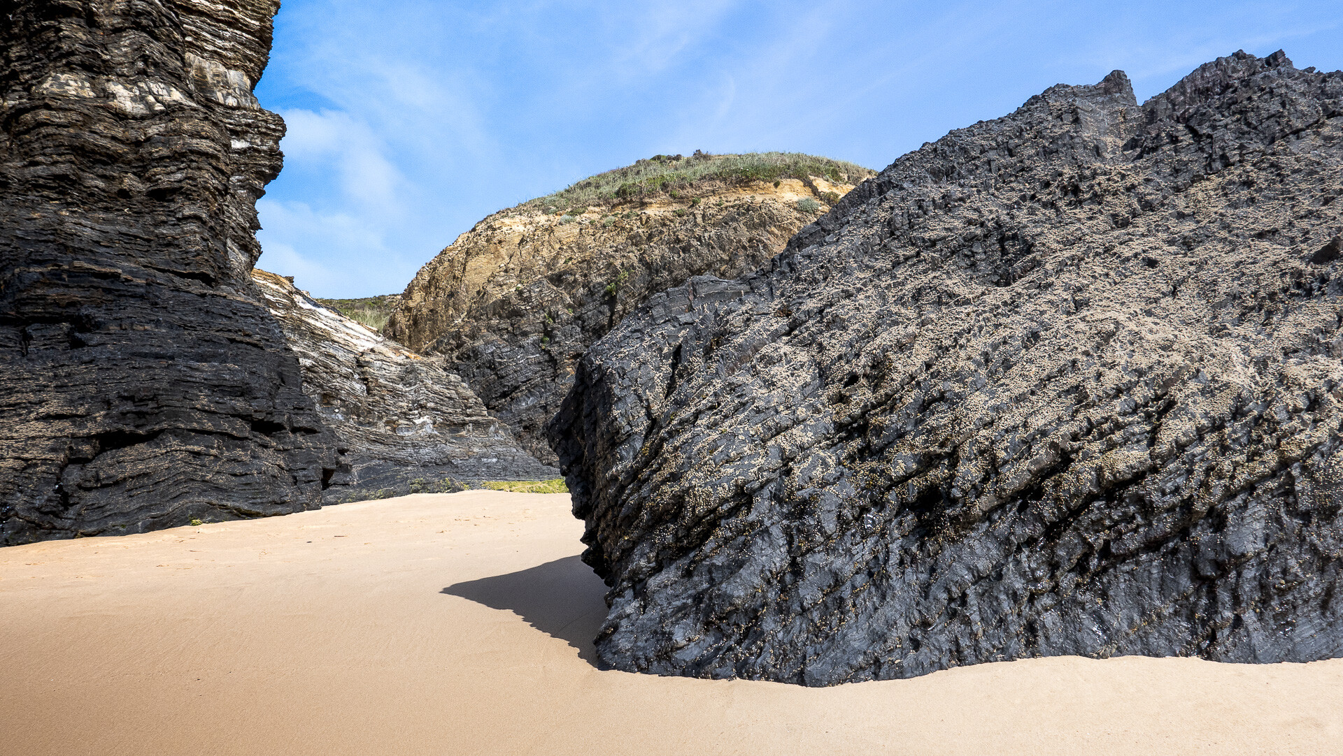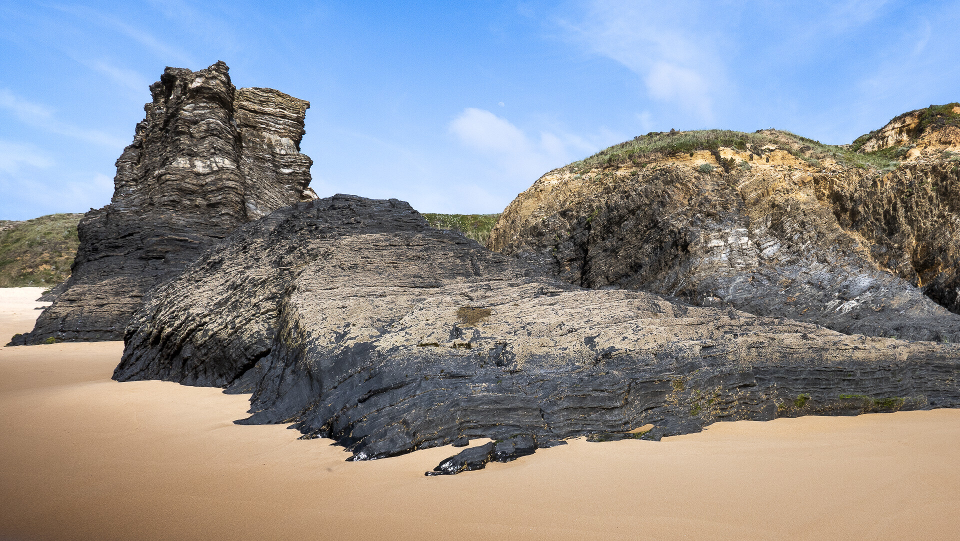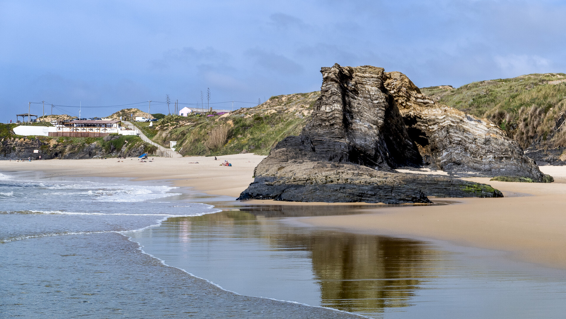 Der Praia de Almograve liegt etwa einen Kilometer entfernt westlich von Almograve. Der ausgedehnte Sandstrand ist von malerischen Klippen umgeben. Er besteht aus einem Nord- und einem Südstrand. Bei Flut werden sie durch eine Felsgruppe, die aus dem Sand emporragt, voneinander getrennt. Die meisten Touristen breiten sich auf dem Südstrand aus, um unabhängig von den Gezeiten zur einzigen Strandbar zu gelangen.